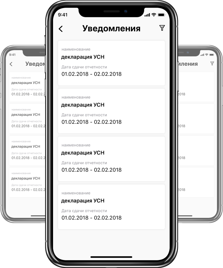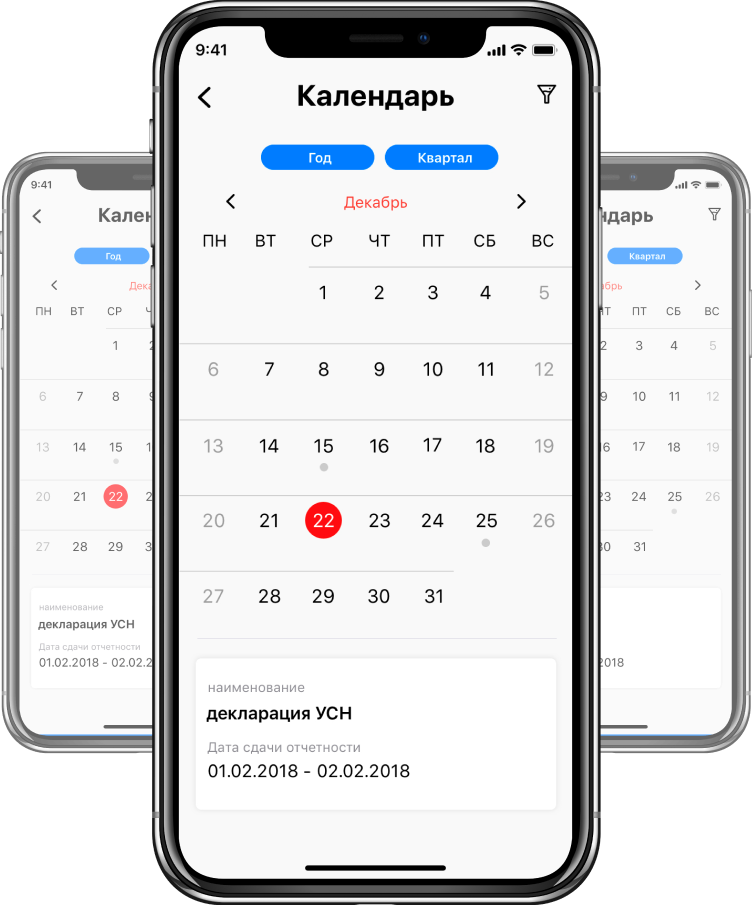 В календаре отмечены все важные события: подача декларации, сдача отчетности в Пенсионный фонд, уплата страховых взносов. События можно отсортировать по типу, дате подачи и другим параметрам.