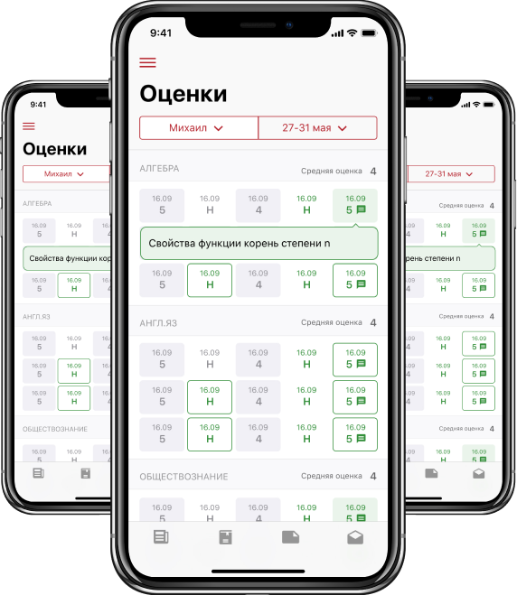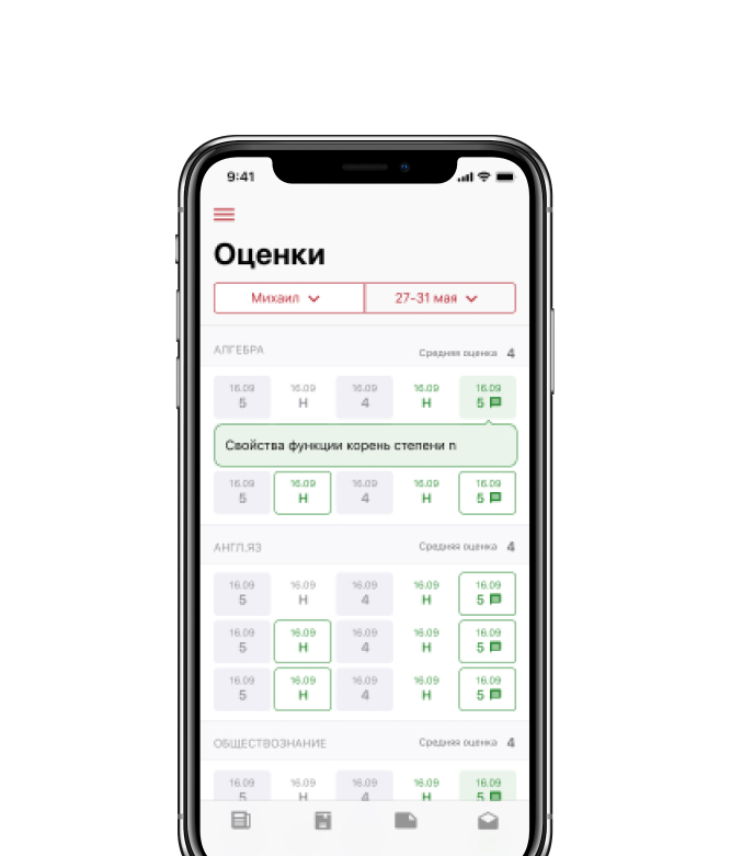 Полная картина успеваемости по всем предметам с комментариями учителей. Оценки можно отсортировать по триместрам и увидеть итоговые результаты.