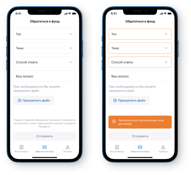 Экран «Обратиться в фонд» вынесен в отдельную вкладку на нижней панели приложения. Это позволяет быстро отправлять вопросы о работе фонда и начислении пенсии — и просматривать ответы.