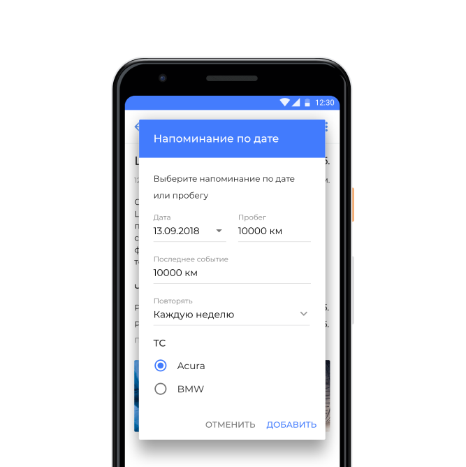 Напоминания можно настроить на конкретную дату, по пробегу, сделать их разовыми или регулярными. Пуш-уведомления заранее напомнят о предстоящем техобслуживании или плановой замене масла.
