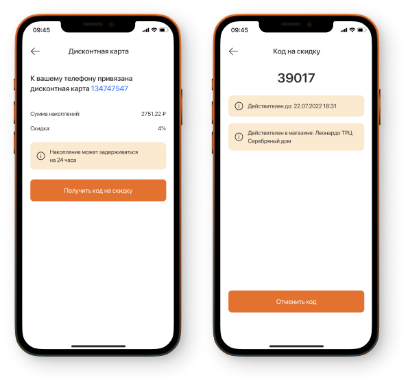 Участники системы лояльности могут получать скидки на покупки в офлайн-магазинах через приложение. Для этого мы подключили возможность привязки дисконтной карты к профилю пользователя и генерации уникальных скидочных кодов.