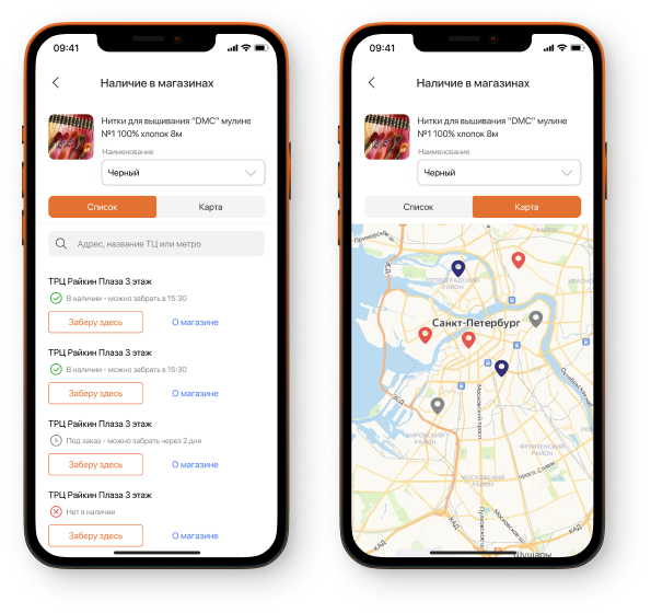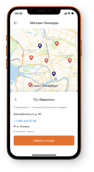 На случай, если нужного товара нет в выбранном магазине, мы реализовали простой и удобный интерфейс для поиска магазина, где товар есть в наличии. Искать можно по списку или на карте.
