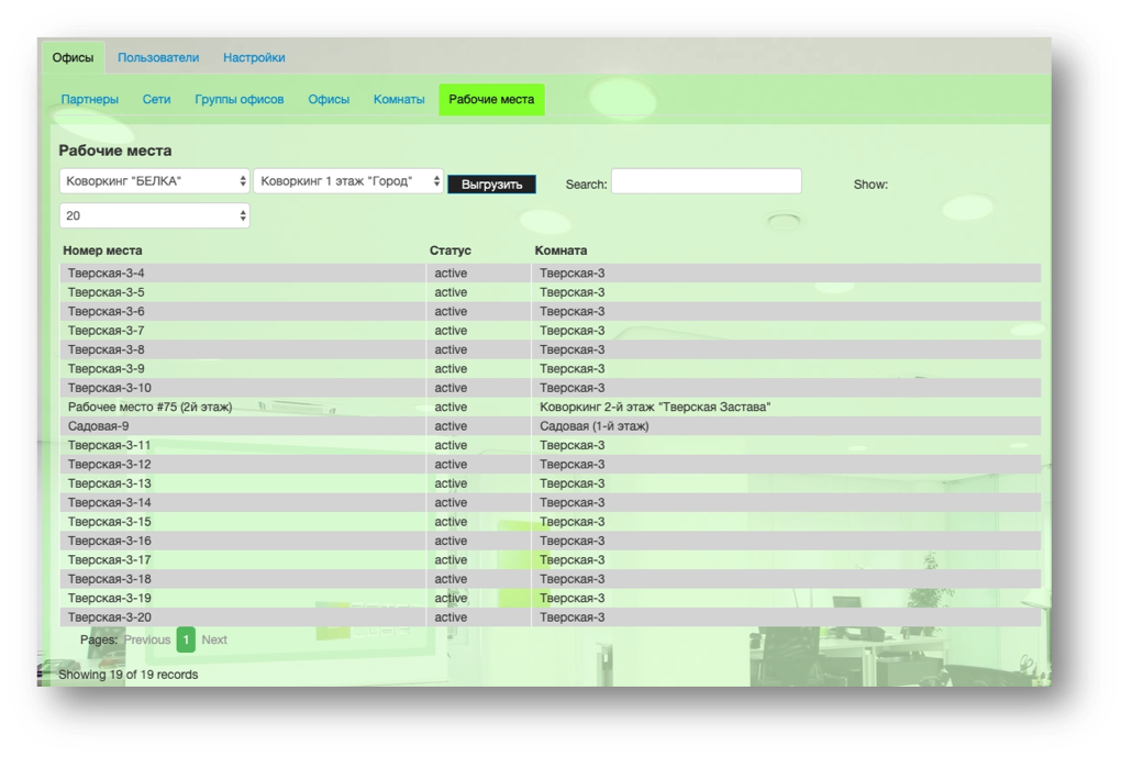 Администраторы коворкингов и партнеры OfficeCube могут управлять рабочими местами на разных площадках, а также выгружать данные в удобном формате.