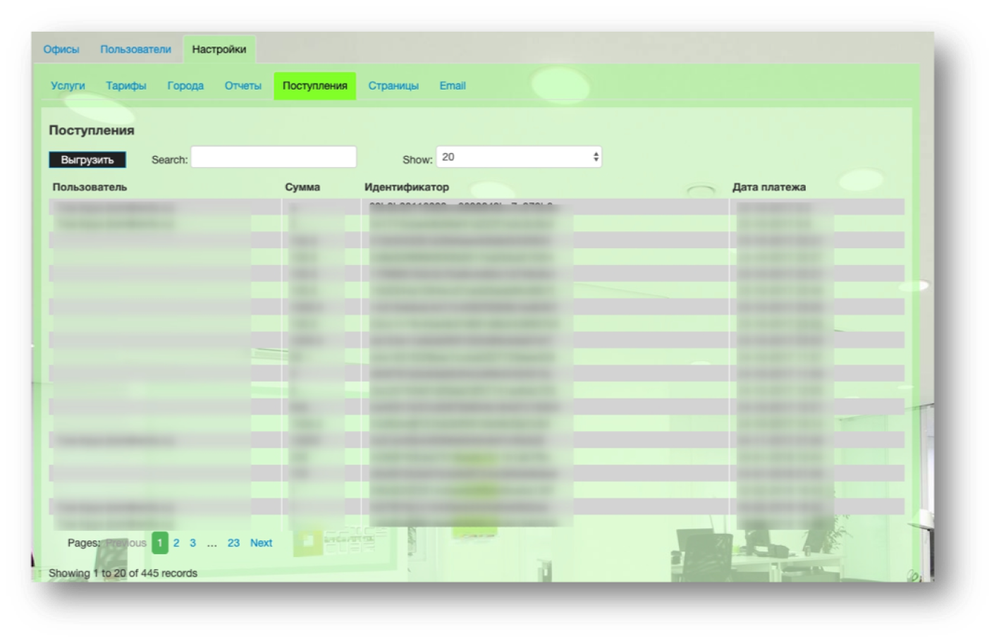 Можно получить отчеты о поступлении денежных средств и заполняемости фондов площадей, срезы по типам объектов и продаже услуг, а также выгрузить данные в форматах CSV и XLS.