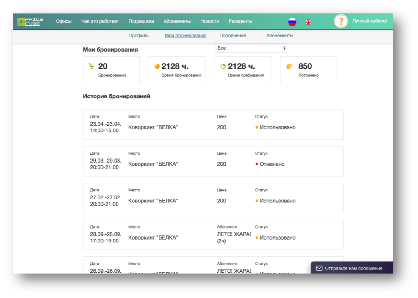 В личном кабинете резидент может посмотреть действующие бронирования и историю заказов. Наиболее важная информация, например об общем количестве бронирований и потраченных деньгах, наглядно представлена на отдельных плашках с крупными цифрами.