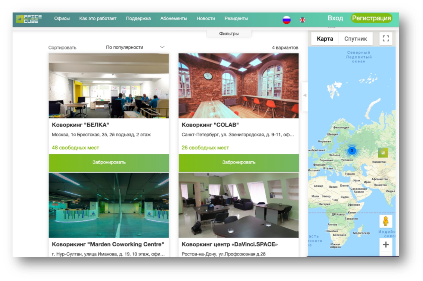 Взглянув на карту, сразу понятно, в каких странах и городах есть коворкинги OfficeCube. Нажав на иконку, вы перейдете на страницу коворкинга с подробным описанием и сможете забронировать рабочее место.