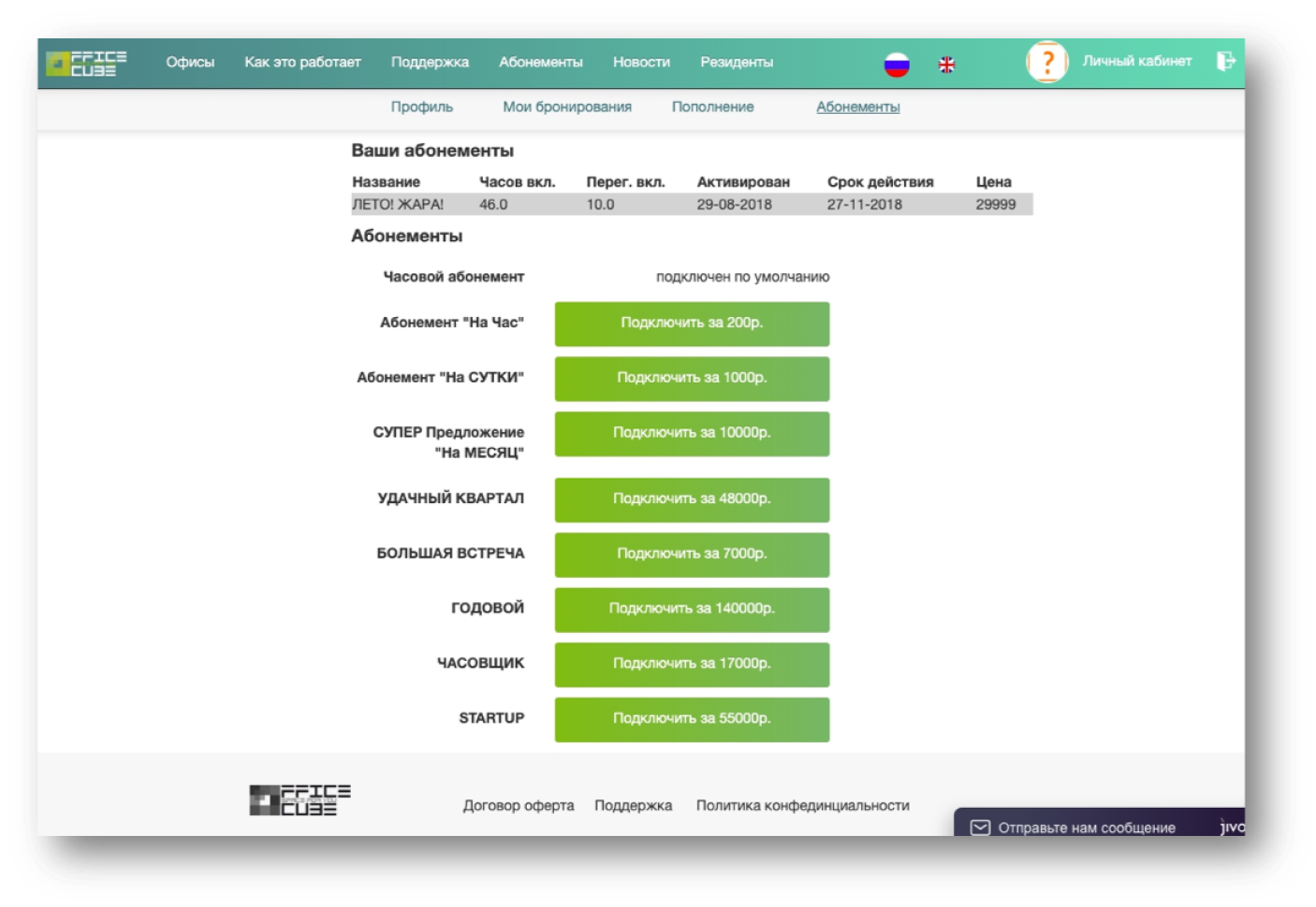 В этом разделе удобно управлять абонементами: посмотреть действующий, выбрать новый. Для каждого абонемента на кнопке бронирования указана цена — пользователь сразу понимает, сколько он стоит.