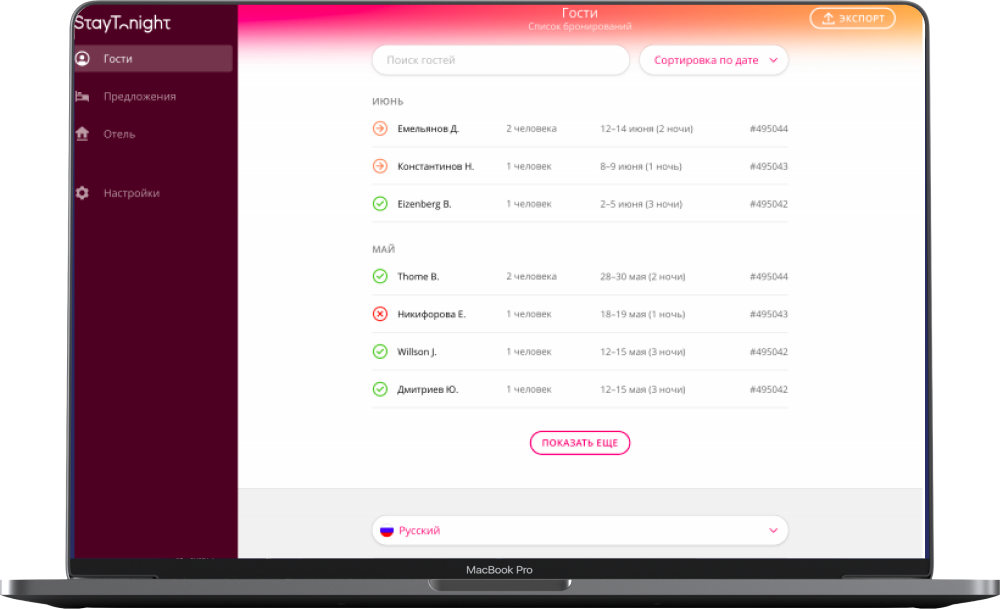 В левом меню «Гости» собраны данные о всех людях, которые забронировали номера. Данные можно отсортировать по дате и другим параметрам.