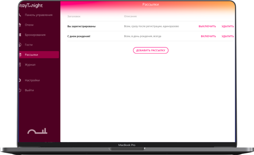 Когда пользователь зарегистрировался в системе или выполнил ключевое действие, ему обычно приходит письмо на почту. Такие рассылки можно делать прямо через StayTonight — сторонний сервис не нужен.