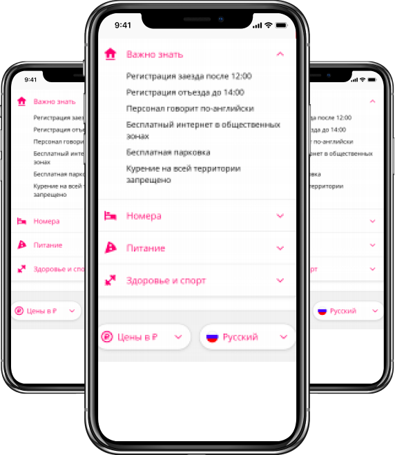 Кликнув на точку на карте, пользователь попадает в карточку отеля. В выпадающем меню представлена информация о номере, правилах проживания, питании.