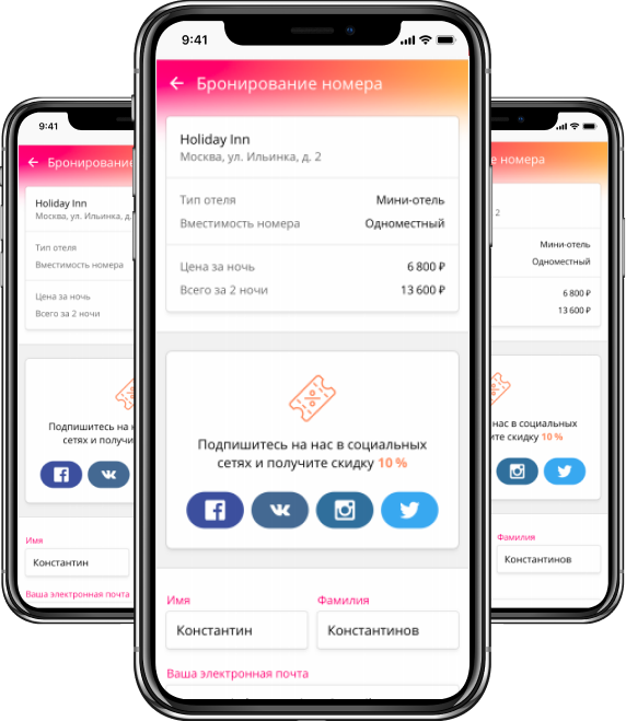 Карточки отелей представлены в сетке. В нее можно интегрировать и другой полезный для пользователя контент, например бонусы за подписку в социальных сетях или акции по системе лояльности.