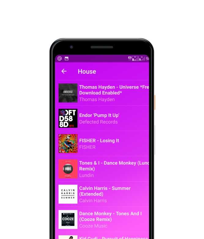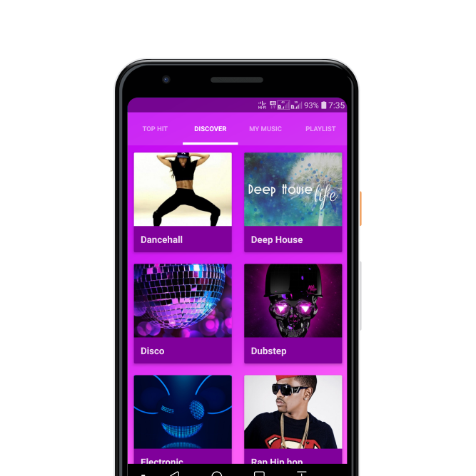 На главном экране отображаются хиты из фонотеки SoundCloud. С помощью верхнего меню можно быстро перемещаться между разделами со своей музыкой и плейлистами.