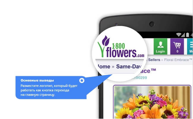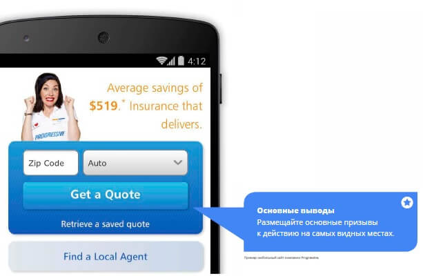 Часто случается, что пользователи мобильных устройств не замечают меню, поэтому следует размещать призывы к действию там, где их точно увидят. Участникам исследования было проще выполнять задания на тех сайтах, где основные призывы к действию размещались в видимой без прокрутки части страницы, а второстепенные действия располагались в меню или в нижней части страницы.