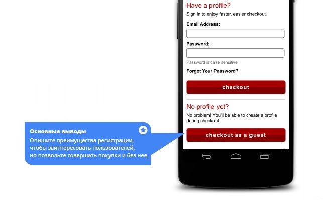 Опишите преимущества регистрации, чтобы заинтересовать пользователей, но позвольте совершать покупки и без нее.