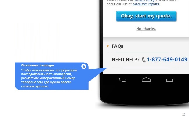 Разместите интерактивный номер телефона в тех разделах, где требуется ввести сложные или конфиденциальные сведения. Пользователи по достоинству оценили возможность позвонить в финансовую компанию, чтобы выполнить операцию по телефону, а не заполнять сложную форму на мобильном устройстве.