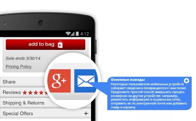 Некоторые пользователи мобильных устройств собирают сведения и возвращаются к ним позже. Предложите простой способ завершить процесс конверсии на другом устройстве: например, разместить информацию в социальных сетях, отправить ее по электронной почте или добавить товар в корзину.