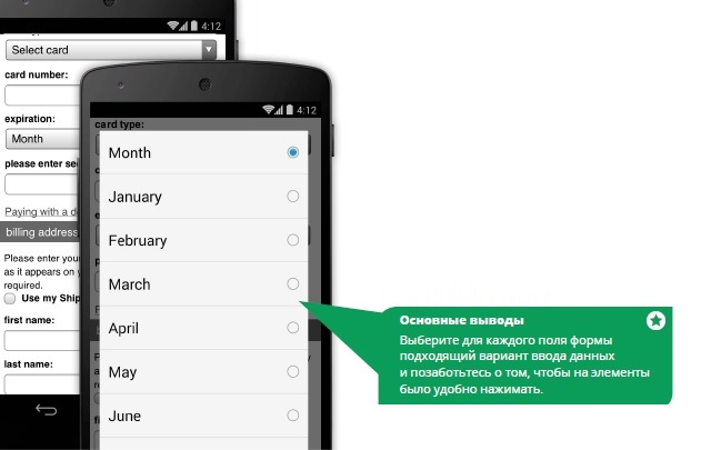 Выберите для каждого поля формы подходящий вариант ввода данных и позаботьтесь о том, чтобы на элементы было удобно нажимать.