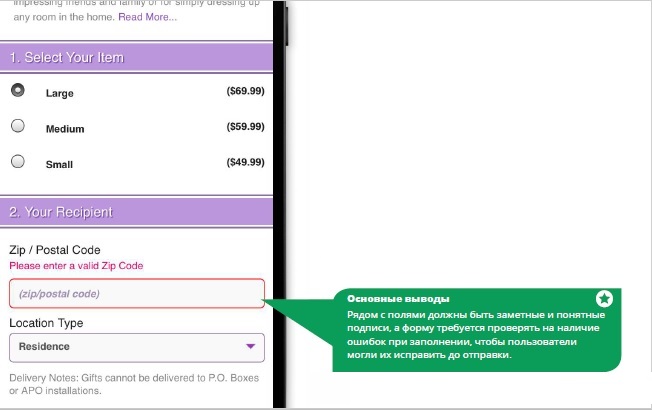 Рядом с полями должны быть заметные и понятные подписи, а форму требуется проверять на наличие ошибок при заполнении, чтобы пользователи могли их исправить до отправки.