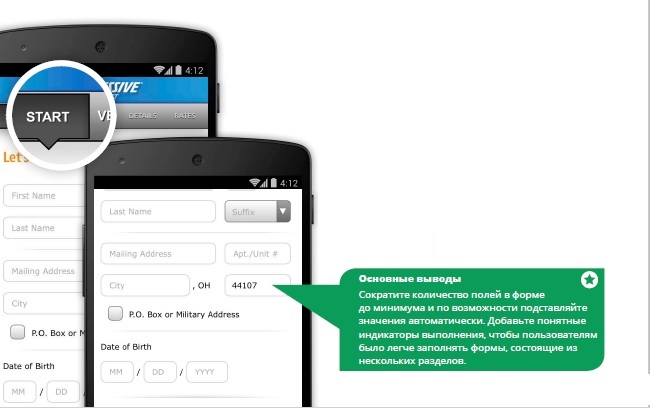 В форме должно быть как можно меньше полей, действия не должны повторяться и сохраненные сведения должны подставляться автоматически. Если форма включает несколько разделов, разместите в верхней части страницы индикатор выполнения. Участников смутила составная форма с очень сложным первым этапом, но не вызвала затруднений другая, более простая, где четко обозначался каждый раздел. Кроме того, пользователям нравилось, когда сложные формы автоматически заполнялись ранее