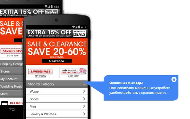 Подумайте, как сократить количество элементов меню до минимума. Например, на мобильном сайте крупного универмага представлены лишь избранные категории товаров, так что пользователи видят более лаконичный список продукции, чем на компьютере.