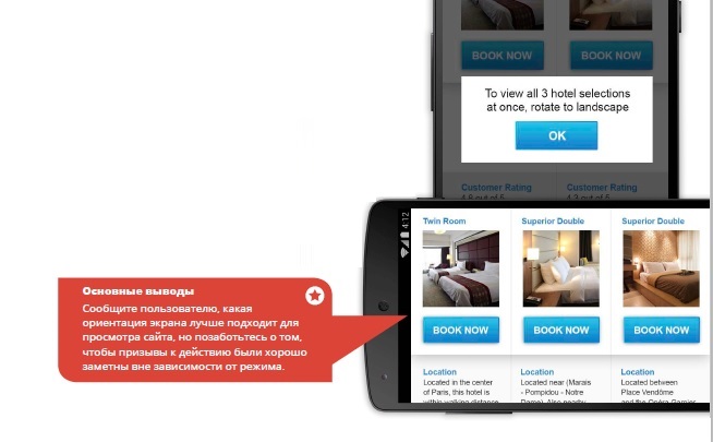 Сообщите пользователю, какая ориентация экрана лучше подходит для просмотра сайта, но позаботьтесь о том, чтобы призывы к действию были хорошо заметны вне зависимости от режима.