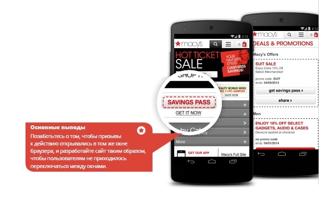 На смартфоне не всегда удобно переключаться между окнами. Кроме того, в этом случае повышается вероятность, что посетитель так и не вернется на ваш сайт. Лучше использовать лишь одно окно и избегать призывов к действию, при нажатии на которые запускаются новые окна. Иногда участники открывали отдельные окна для поиска купонов – возможно, имеет смысл разместить их на сайте, чтобы пользователи не отвлекались.