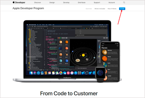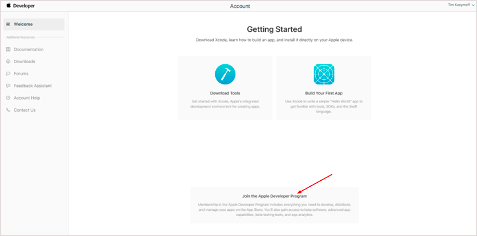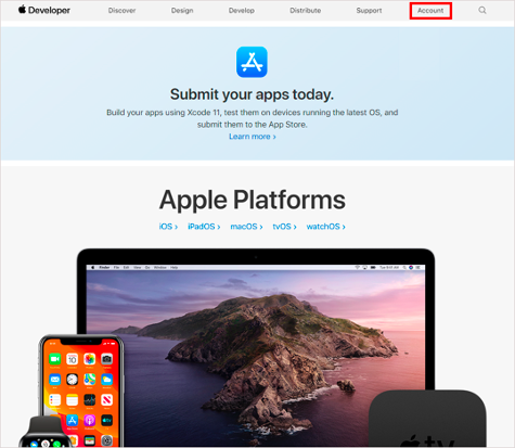 Перейдите на сайт Apple.Developer. Справа вверху нажмите Account.