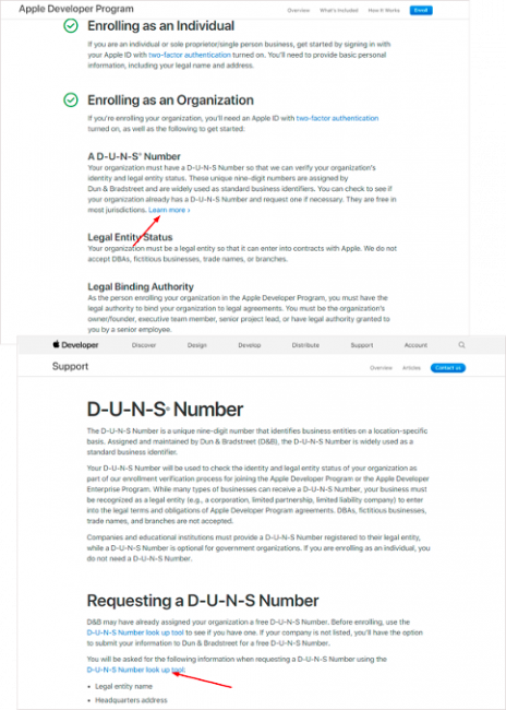В части статьи, озаглавленной как Enrolling as an Organization, выбираем Learn more. На открывшейся странице выберите пункт D-U-N-S number look up tool (инструмент проверки D-U-N-S).