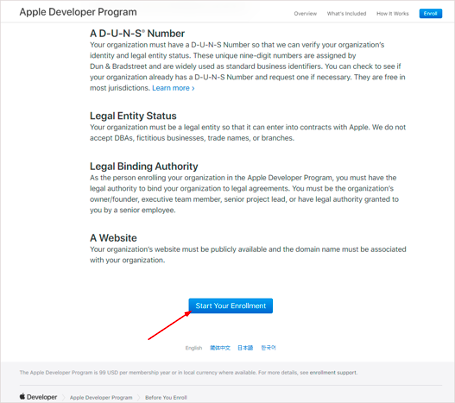 После получения номера D-U-N-S вернитесь на сайт Apple, нажмите Start Your Enrollment.