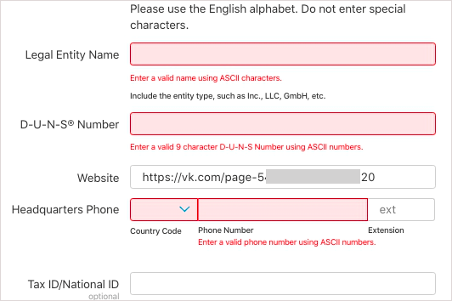В открывшемся окне впишите название вашей организации и номер D—U—N—S в точности так, как это указано в письме, которое вы получали.