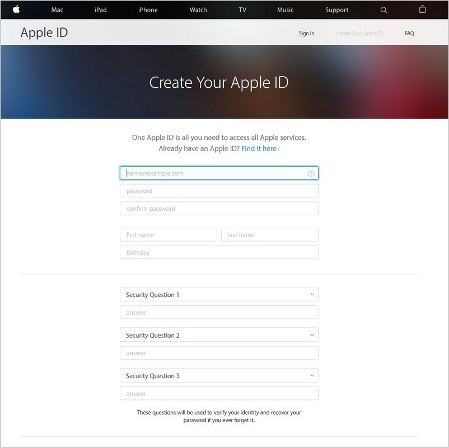 1. Для создания Apple ID перейдите по ссылке. Заполните все поля и запомните контрольные вопросы. Apple ID необходимо регистрировать на имя одного из учредителей компании или генерального директора.