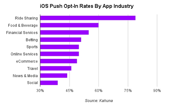 Для некоторых приложений необходимость push-уведомлений очевидна, например для мессенджеров. Пользователи сами понимают необходимость получения push-уведомления, и заинтересованы в своевременном получении важной информации. Приложения с наибольшими показателями получения push уведомлений с понятной ценностью уведомлений: информация о поездках (79%), еда и напитки (60%) и финансовые услуги (55%). Пользователи интуитивно понимают что push-уведомления будут играть важную роль в функционале этих приложений. Например, своевременно получить информацию о прибывшем такси или подтверждение заказа в ресторане.