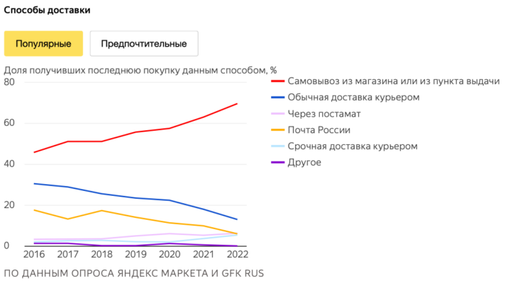 В 2022 году 76% участников опроса Яндекс Маркета и Gfk Rus получили свои интернет-заказы в магазине или пункте выдачи. 12 % опрошенных заказали обычную курьерскую доставку, а 5% покупателей выбрали доставку Почтой России.