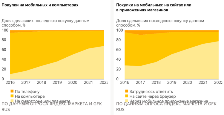 По данным Яндекса за 2022 год, пользователи смартфонов совершают в 3 раза больше покупок в приложении онлайн-магазина, чем на его сайте. При этом доля покупок со смартфонов и планшетов продолжает расти и за 2022 год уже превысила 67 %.